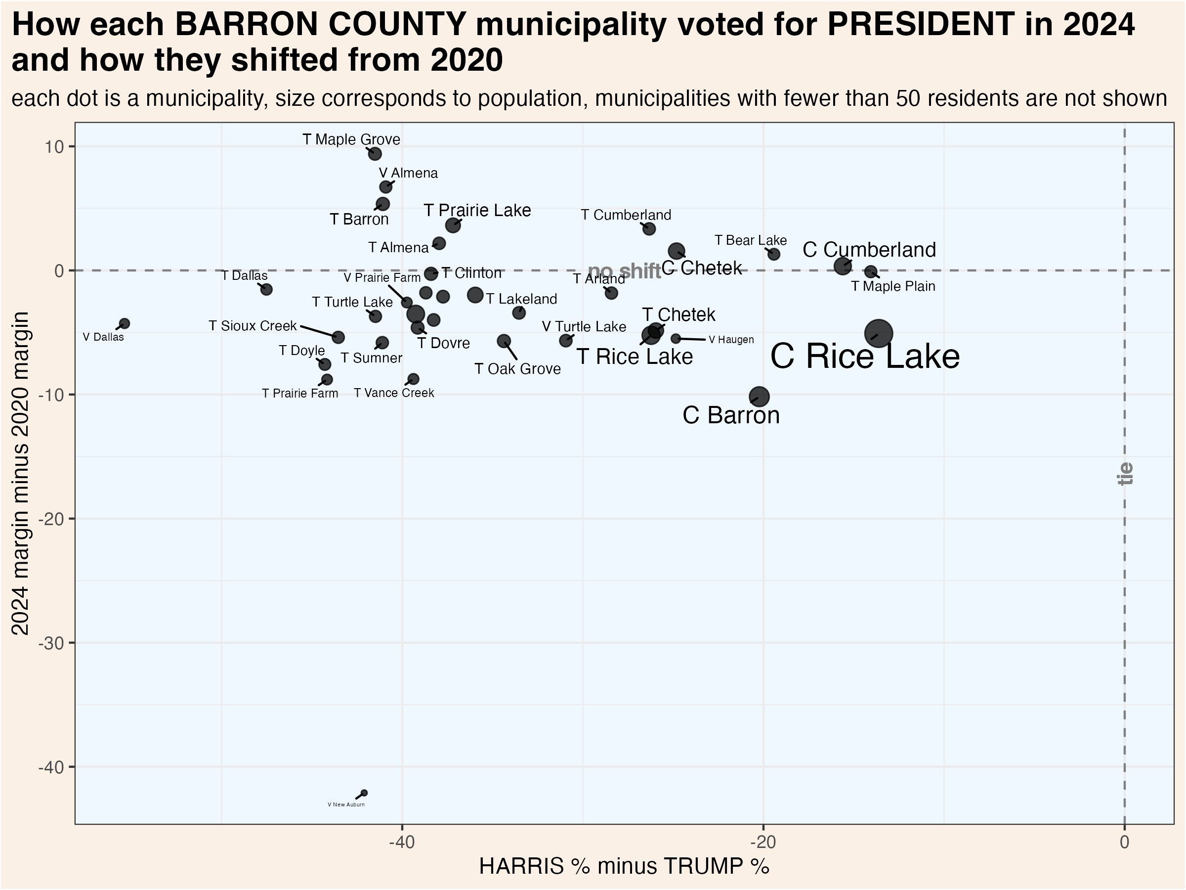 Barron County (pop. 47,000) was politically competitive in the 2000s, but it has grown increasingly Republican since then. Barack Obama won 53% of the vote in 2008. Mitt Romney won just over 50% in 2012. Trump won 60% in 2016 and 62% in 2020 and 2024. Compared to the state as a whole, Barron County is more white, older, has lower levels of educational attainment, and generally lower median incomes.